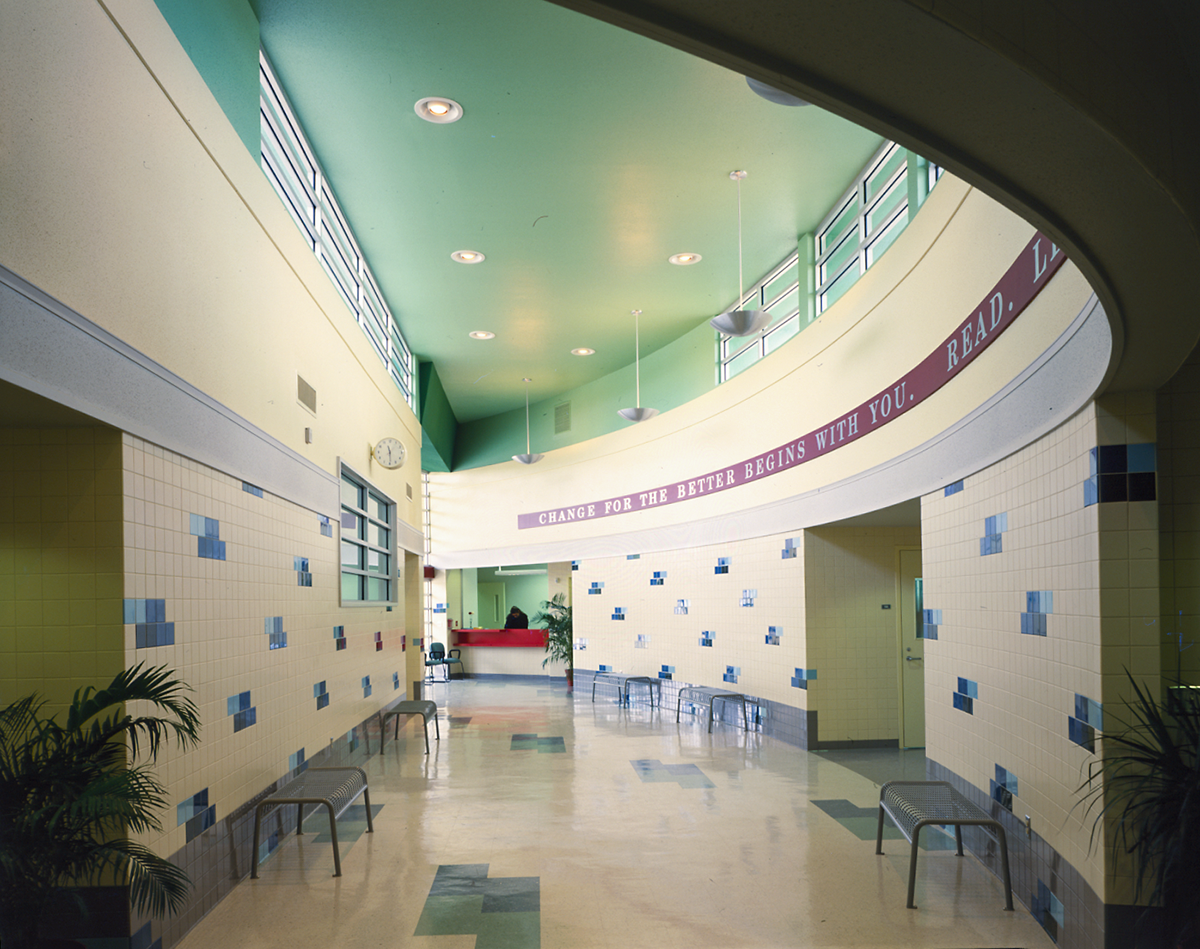 Incorporated imagery reinforced the building’s friendliness: a playful glazed brick “pixel” pattern wraps the exterior façade, and a treelike green roof frames a welcoming entry corridor. The symbolic idea of the tree as a shelter for a learning community sets an aspirational tone. A ribbon of clerestory windows illuminates and enlivens a double-height central gathering space. On a secondary exterior elevation, a mural niche offered a prime opportunity for community engagement through the artistic expression of local youth. Throughout, we worked to fully exploit creative application of an institutional material palette, calibrated for durability and cost-effectiveness.