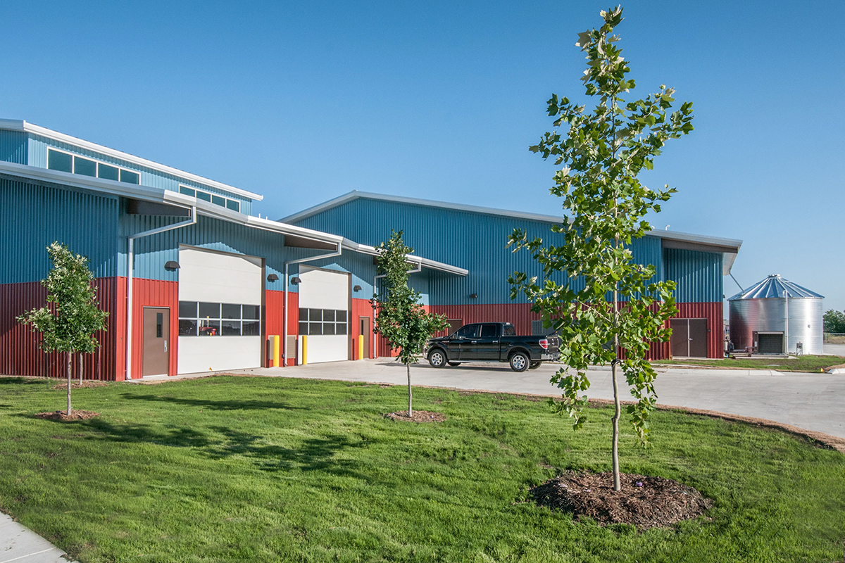 The buildings create a campus on a 13-acre truck parking area. The facility houses multiple functions: the administrative/crew quarters building, a vehicle maintenance facility, a seven-bay truck/heavy truck cleanout facility, an auto wash, fuel pump islands, and a storage/shops/ welding building.