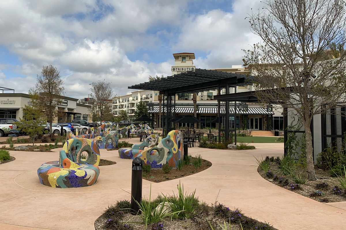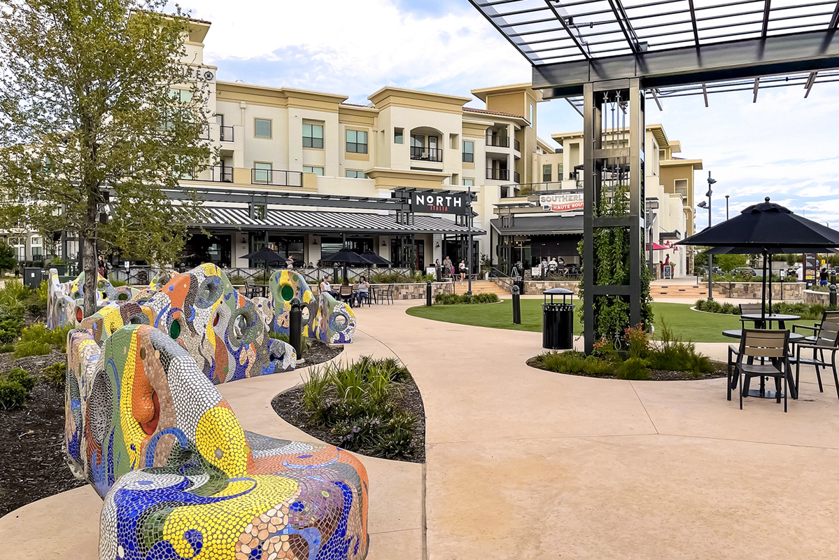 We further developed the character of this outdoor space as a central meetup spot, featuring a series of sculptural artisan-made benches inlaid with tile mosaic by acclaimed San Antonio artist Oscar Alvarado. By creating a usable, people-scaled park setting adjacent to restaurants, the Rim Commons has energized its shopping street by simply providing the kind of relaxed setting people seek out.