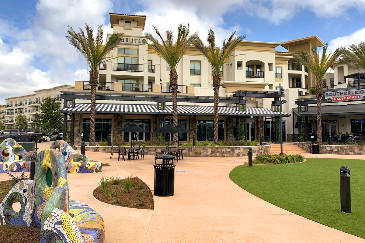 The solution? Accessible, usable outdoor space connected to restaurant retail to create a destination within a destination. In a two-step strategy, we took in the traffic circle and created a landscaped peninsula. We followed with a prominent, continuous shade structure along the head of the new “commons,” adjoining the ground floor retail spaces of the apartment building. As reconfigured, the client could then court top restaurant tenants, offering prime spaces featuring outdoor dining terraces. With the addition of popular restaurants Southerleigh and North Italia, our solution was complete.